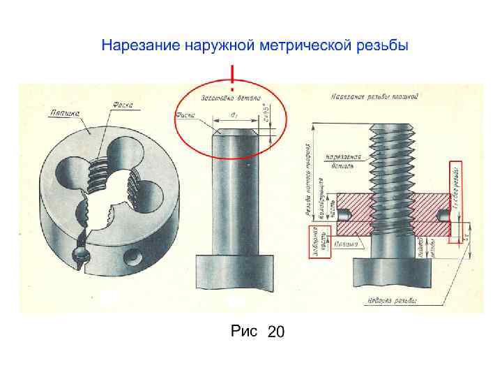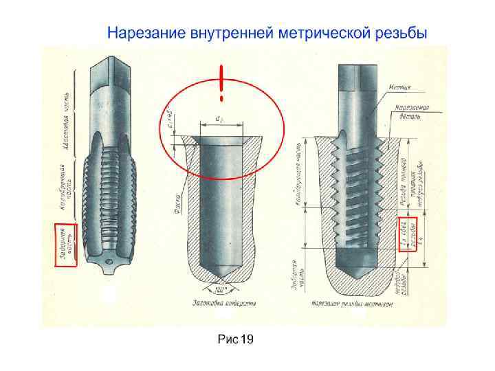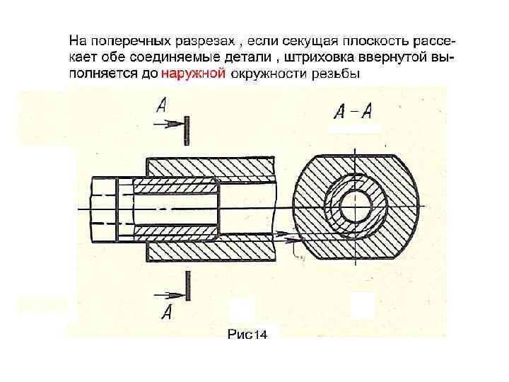 Изображение и обозначение метрической резьбы на чертеже детали Внешняя резьба Тонкая линия при изображении на плоскости, параллельной оси резьбы Расстояние м. у сплошной и тонкой линиями 0, 8 и не больше шага резьбы Тонкая линия при изображении на плоскости, перпендикулярной оси резьбы Внутренняя резьба