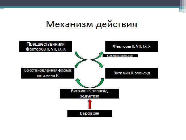Варфарин • Варфарин — лекарственное средство, антикоагулянт непрямого действия. Антикоагулянт непрямого действия. Блокирует в печени синтез витамин Кзависимых факторов свертывания крови, а именно - II, VII, IX и Х. Концентрация этих компонентов в крови снижается, процесс свертывания крови замедляется.