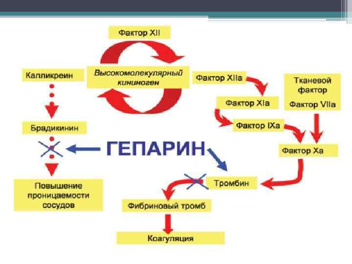 Фармакодинамика. • Как антикоагулянт прямого действия гепарин угнетает агрегацию тромбоцитов путем взаимодействия с антитромбином III. Является естественным ингибитором факторов свертывания крови сывороточных протеаз, в частности, фактора Ха (Стюарта—Пpayэра), тромбина (На), а также факторов 1 Ха (Кристмаса), Ха (Розенталя), XI 1 а (Хагемана). Наиболее чувствителен к ингибирующему действию гепарина тромбин. Определенное значение в антикоагулянтом эффекте гепарина имеет его способность увеличивать продукцию ингибитора тканевого фактора и усиливать фибринолиз путем стимуляции образования инактиватора плазминогена. • Кроме влияния на коагуляцию гепарину присущи другие биологические свойства. Он оказывает противовоспалительное действие через угнетение хемотаксиса нейтрофилов, активности миелопероксидазы, лизосомальных протеаз, свободных радикалов, а также функции Т-лимфоцитов и факторов комплемента. Кроме того, ему присуши антимитогенное и антипролиферативное влияние на гладкие мышцы сосудов, снижение вязкости плазмы, стимуляция ангиогенеза. Гепарин улучшает коронарное кровообращение и функцию миокарда за счет развития коллатералей у больных с острым инфарктом миокарда. • Гепарин также влияет на обмен липидов. Он стимулирует выделение липопротеиновой и печеночной липаз, которые обеспечивают внутрисосудистые процессы делипидизации хи -ломикронов и липопротеинов очень низкой плотности. Вследствие этого повышается концентрация СЖК в плазме, которые используются организмом как источник энергии. Улучшает микроциркуляцию, повышает диурез (антагонизм с альдостероном). Принимает участие в тканевом обмене — снижает уровень глюкозы, повышает содержание бета-глобулина в крови, а также стойкость к гипоксии, некоторым экзотоксинам.