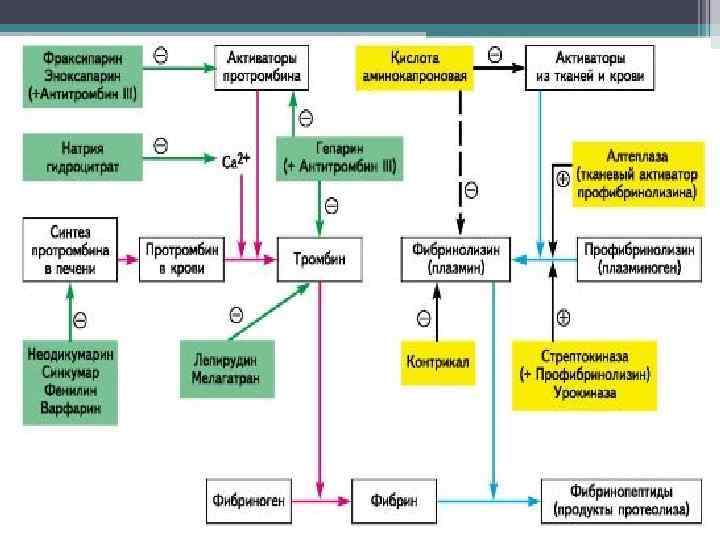 Антикоагулянты • Антикоагулянты - ЛС, воздействующие на плазменные факторы свертывания крови и в конечном итоге противодействующие влиянию тромбина на фибрин. Антикоагулянты препятствуют тромбообразованию; при этом образовавшийся тромб может подвергнуться обратному развитию за счет активации обратного фибринолиза.