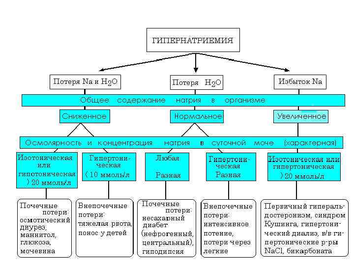 ГИПЕРНАТРИЕМИЯ дегидратация Увеличенная потеря воды • через почки (тубулярная недостаточность, несахарный диабет, глюкозурия при сахарном диабете, прием диуретиков ) • через кожу ( потоотделение) • через легкие ( гипервентиляция ) • через желудочно-кишечный тракт ( неукротимая рвота, понос ) Снижение поступления воды • неадекватное кормление новорожденных • дисфагия у стариков • недостаточное питье