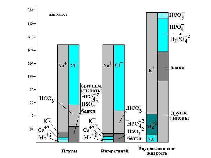 Распределение ионов между вне- и внутриклеточным пространством в ммолях/л воды