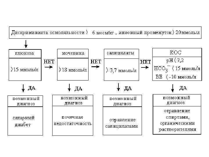 Диагностика ОПН • Повышение в сыворотке мочевины и креатинина * Если мочевина , а креатинин , то это дегидратация или гиперкатаболизм при лихорадке • Преренальная причина, если осмоляльность мочи > 500 мосмол/кг, в сыворотке мочевина/креатинин > 40 • Ренальная причина, если осмоляльность мочи < 350 мосмол/кг, мочевина/креатинин < 20 • Cиндромальная диагностика: следить за [ K+ ] ( K+ до 6, 5 ммоль/л может вызвать остановку сердца