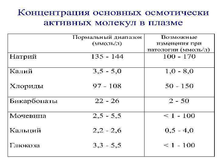Осмоляльность измеряется как концентрация тех же осмотически активных компонентов, но выражается в осмолях/кг Н 2 О. . Референтные интервалы для биожидкостей человека. 1 день дети Моча 276 – 305 мосмолей кг Н 2 О 28 дней Взрослые 275 – 300 мосмолей кг Н 2 О 7 дней Плазма, сыворотка 274 – 305 мосмолей кг Н 2 О 280 – 300 мосмолей кг Н 2 О 50 – 1200 мосмолей кг Н 2 О