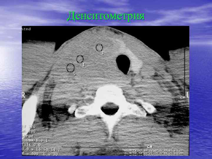 Денситометрический анализ Определение основных видов патологических образований: - обызвествленных - мягкотканных - жидкостных - жиросодержащих - воздухсодержащих