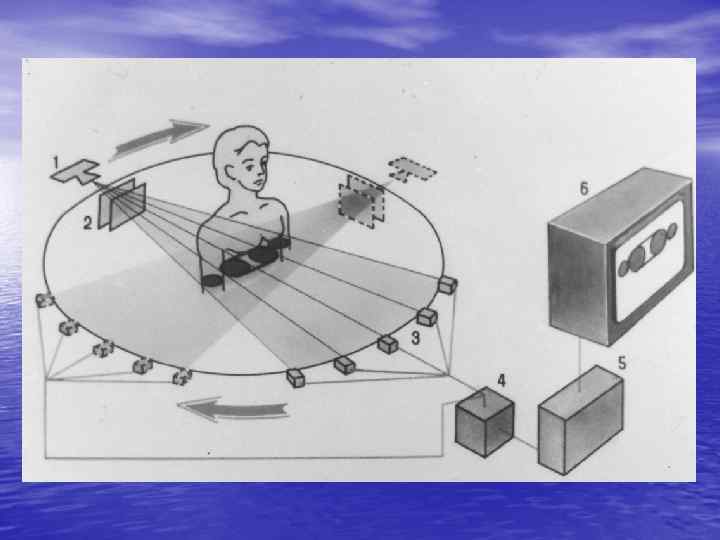 ТИПЫ КТ УСТАНОВОК ü Первое и второе поколения: ротационно-трансляционные (рентгеновская трубка и несколько детекторов жестко укреплены на прямоугольной раме). ü Третье поколение: сканирование объекта осуществляется широким веерообразным пучком рентгеновских лучей, который полностью перекрывает тело пациента. ü Четвертое поколение: детекторы жестко укреплены по всей окружности рамы сканирующего устройства, внутри которой вращается только рентгеновская трубка. ü Пятое поколение: функцию рентгеновской трубки выполняет компактный линейный ускоритель электронов - формирование и пространственная ориентация электронного пучка (кардиология).