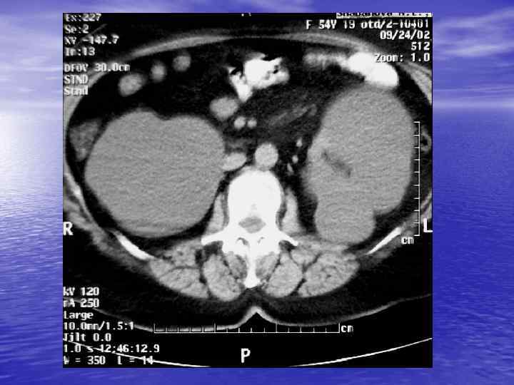 Шкала Хаунсфилда (HU) üЗа ноль принят коэффициент ослабления воды üНижняя граница (-1000 HU) соответствует коэффициенту ослабления воздуха. üВерхняя граница шкалы вариабельна, так как она соответствует коэффициенту ослабления кортикального слоя кости (+1000 НU).