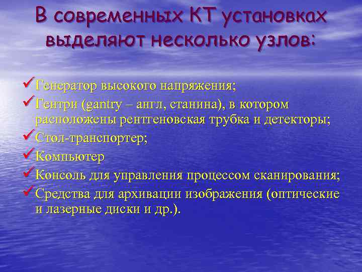 В современных КТ установках выделяют несколько узлов: üГенератор высокого напряжения; üГентри (gantry – англ, станина), в котором расположены рентгеновская трубка и детекторы; üСтол-транспортер; üКомпьютер üКонсоль для управления процессом сканирования; üСредства для архивации изображения (оптические и лазерные диски и др. ).