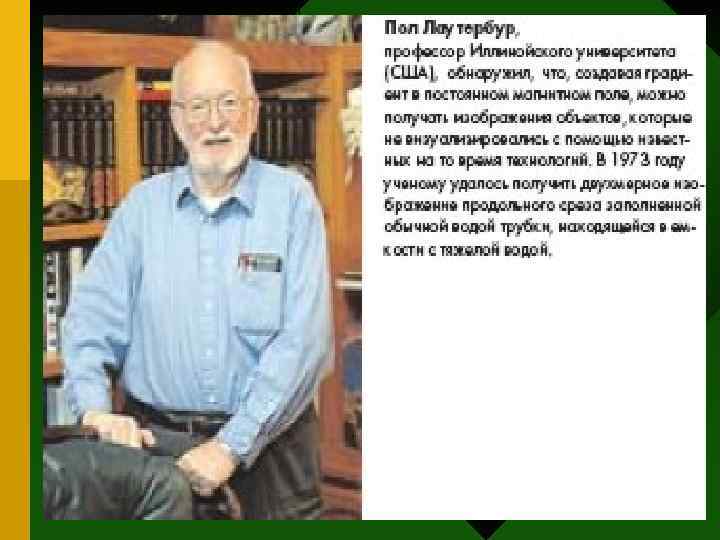 Ядерно-магнитный резонанс • Суть его состоит в том, что ядра некоторых атомов, находясь в магнитном поле, под действием внешнего электромагнитного поля способны поглощать энергию, а затем излучать ее в виде радиосигнала.