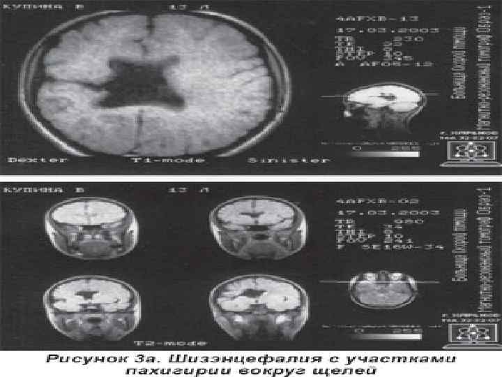 Понятие о шизэнцефалии Своеобразной аномалией головного мозга является шизэнцефалия - тотальная патология, занимающая большую часть головного мозга и простирающаяся от желудочков до коры головного мозга. Данный порок развития хорошо визуализируется на томограммах головного мозга в виде щелей различной степени выраженности. При данном пороке динамика циркуляции ликвора по желудочкам не нарушена, она полностью компенсирована. Проявления шизэнцефалии ассоциируются со многими неврологическими симптомами в виде: