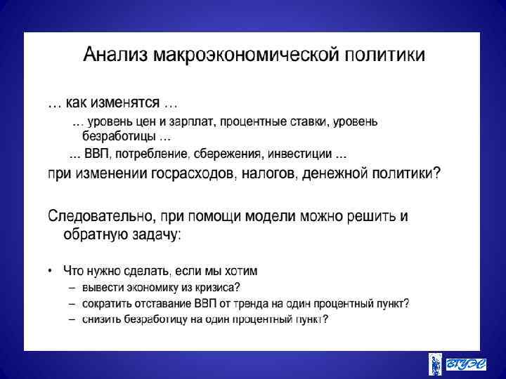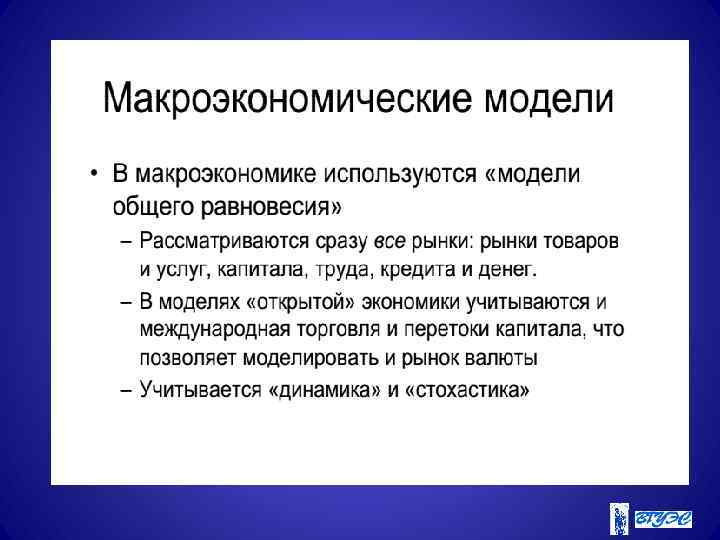 Джон Мейнард Кейнс • Предложил теорию, основанную на стороне спроса и отклонениях от конкурентного равновесия • Отклонения: – Медленно подстраивающиеся цены и зарплаты • В результате, корректировка рынка труда может занять очень много времени – Неполнота информации • Банки не знают, кому давать ссуды, вкладчики не знают, куда нести деньги, рушится банковская система