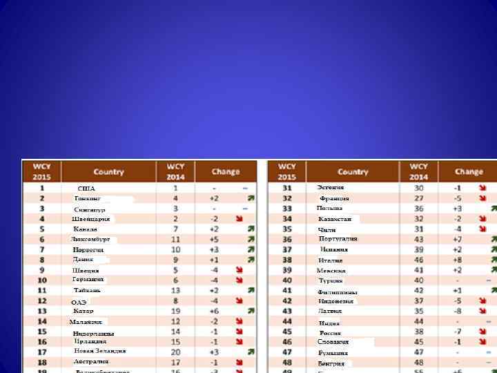 Рейтинг конкурентоспособности стран мира Institute of Management Development, World Competitiveness Center. The IMD World Competitiveness Yearbook 2014. Рейти нг Страна Индекс 1 Соединенные Штаты Америки 100. 000 2 Швейцария 92. 423 3 Сингапур 90. 966 4 Гонконг 90. 329 5 Швеция 85. 833 6 Германия 85. 782 70