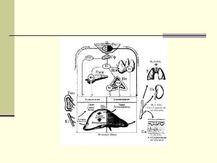 Нейрогуморальная регуляция обмена белков Синтез белка стимулируют: n Соматотропный гормон, n Тироксин (Т 3 , Т 4), n Глюкокортикоиды (в печени). Распад белка увеличивают: n Глюкокортикоиды (в мышцах и лимфоидной ткани) и n глюкагон
