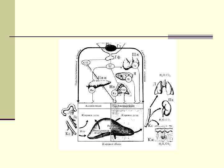 Регуляция обмена липидов Нервная регуляция: регуляция n Симпатические влияния →увеличивают распад и тормозят синтез триглицеридов в в жировой ткани. n Парасимпатические влияния – способствуют отложению жира. Гуморальная регуляция: регуляция Активируют мобилизацию жира и его окисление – адреналин (через β-адренорецепторы) и гипогликемия (через торможение секреции инсулина) Другие гормоны (СТГ, АКТГ, глюкагон, вазопрессин) оказывают у человека очень слабое действие. Тормозят мобилизацию жира и активируют его синтез – инсулин (жировая ткань!), глюкокортикоиды (депонирование жира в области лица и шеи), адреналин (через α-адренорецепторы)