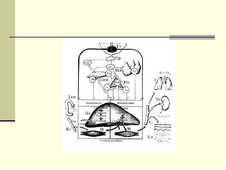Регуляция основного обмена n Регуляция основного обмена осуществляется: Ш с помощью гормонов (СТГ, тиреоидные, половые); Ш через вегетативную нервную систему (симпатический отдел ↑ – катаболизм, парасимпатический отдел ↑ – анаболизм ). n Величину основного обмена определяют путем измерения количества выделяемого организмом тепла: Ш прямая (физиологическая) калориметрия) или Ш путем регистрации потребления кислорода и выделения углекислого газа – непрямая (респираторная) калориметрия).