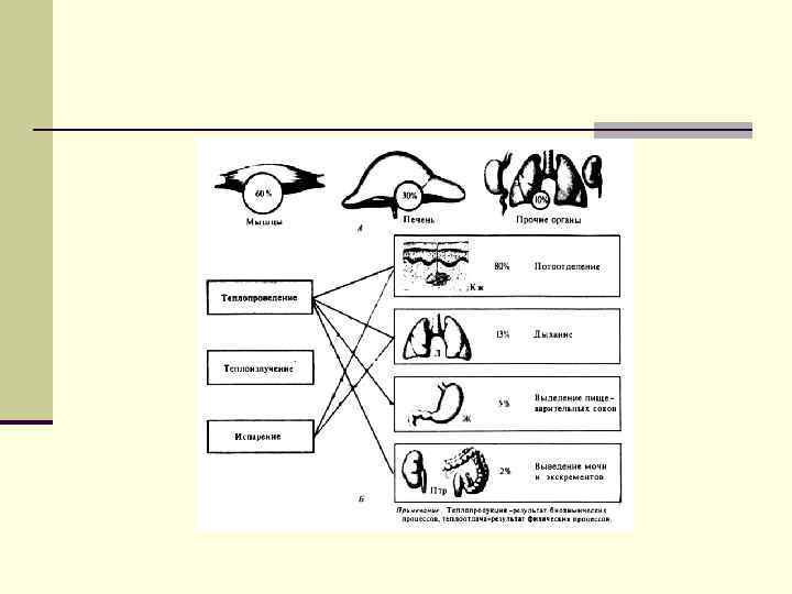 Теплообразование (теплопродукция, химическая терморегуляция) Обмен веществ – источник образования тепла – обеспечивает защиту организма от холода. Роль разных органов в теплопродукции различная: ь Органы брюшной полости (печень!) – 34%; ь Мозг – 16, ь Мышцы – 16, ь Сердце – 11, ь Почки – 8%.