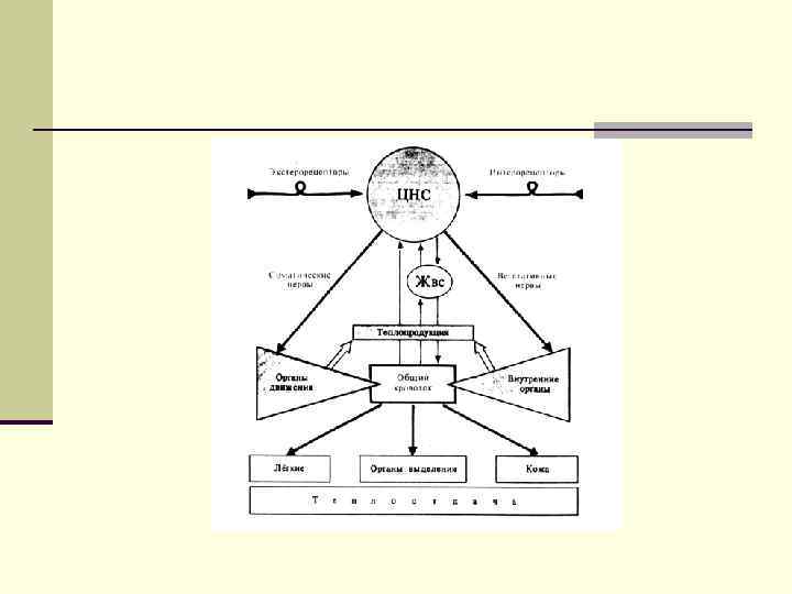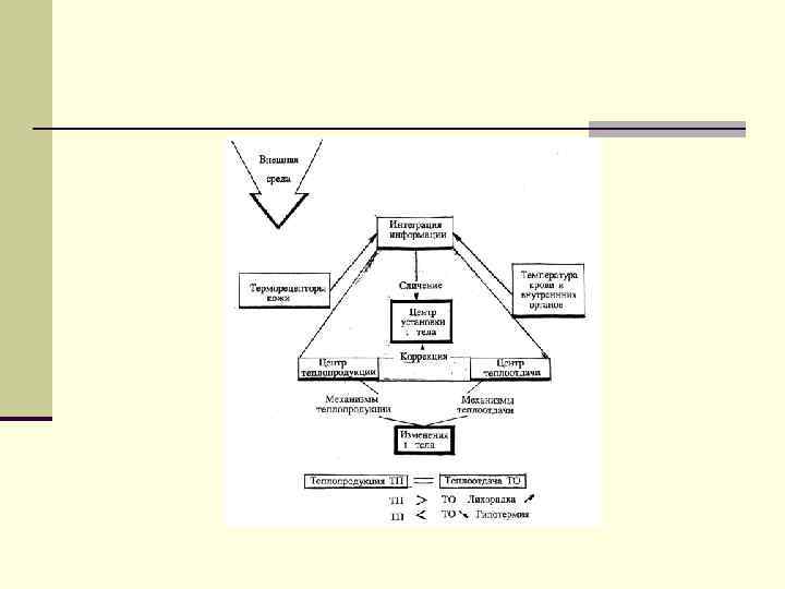 Гипоталамус n Центр теплопродукции – задний гипоталамус: вентролатеральные, промежуточные и вентромедиальные ядра. n Центр теплоотдачи – передний гипоталамус: паравентрикулярные, супрахиазматические, супраоптические ядра, медиальная преоптическая область
