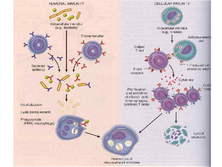 ► Гуморальный: внеклеточные микробы (чаще бактерии) → В-ЛФ трансформируются в плазматические клетки и продуцируют АТ → АТ связывают АГ → нейтрализуют их путем лизиса с участием комплемента или фагоцитоза ► Клеточный: внутриклеточные микробы → при помощи АГ-презентирующей клетки представляются Т-хелперам → выделение цитокинов → активация макрофагов и цитотоксических клеток → лизис инфицированной клетки