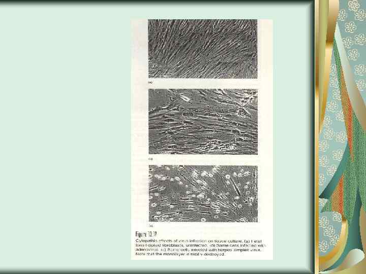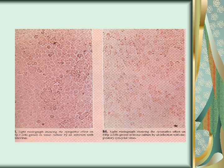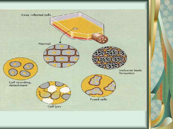 Цитопатическое действие 1. Полная дегенерация клеточного монослоя. Отдельные клетки, которые остаются живыми, изменяют свою мо-рфологию, у них заметный пикноз ядра и цитоплаз-мы. (пикорнавирусы -вирусы полиомиелита Коксаки, ЕСНО). 2. Симпластообразующий тип ЦПД (возбудители кори, эпидемического паротита, парагриппа, респираторносинцитиальных вирусов). Возникают многоядерные гигантские клетки (симпласты или синцитии). 3. Круглоклеточная дегенерация (аденовирусы). При репродукции риновирусов образуются округлые клетки, которые имеют отростки, а при размножении герпесвирусов наблюдается формирование подобных клеток одинакового размера, которые разбросаны по всему монослою. 4. Пролиферативный тип изменений (онкогенные вирусы) формирование нескольких слоев клеток.
