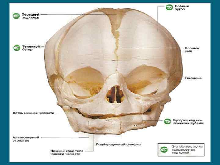 Череп новорожденного значительно отличается от черепа взрослого человека -мозговой череп преобладает над лицевым -число костей больше -между костями крыши и основания черепа имеются прослойки перепончатой соединительной ткани и хряща -лицевой череп короткий и широкий, в нем хорошо развиты глазницы, верхняя челюсть, имеющая зачатки воздухоносных пазух и лишенная альвеолярных отростков -лобные пазухи практически отсутствуют -основание черепа сравнительно малое и длинное, а свод большой. -затылочная кость состоит из базилярной части, чешуи и латеральных частей, между которыми имеются хрящевые прослойки. -лобная кость состоит из двух костей, соединенных хрящевым швом -большие крылья не сращены с телом клиновидной кости, малые крылья недоразвиты -вершина пирамиды височной кости развита слабо, наружный слуховой проход короткий -сосцевидный отросток почти отсутствует -средняя черепная ямка глубокая и широкая -задняя черепная ямка — плоская и узкая