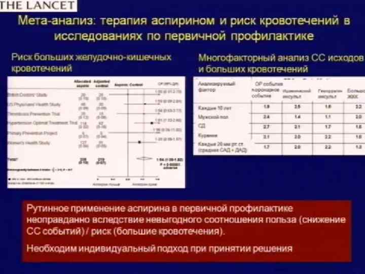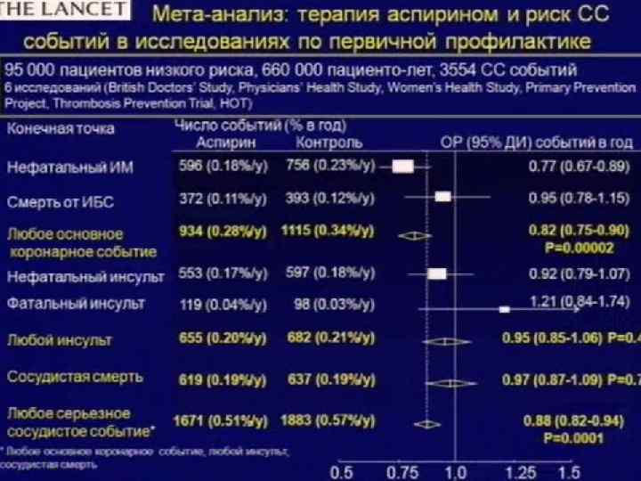 Следует ли назначать аспирин для первичной профилактики, учитывая соотношение польза/риск? Мета-анализ • Antithrombotic Thrialists’ Collaboration. Lancet, 2009; 373: 1849 – 1860.