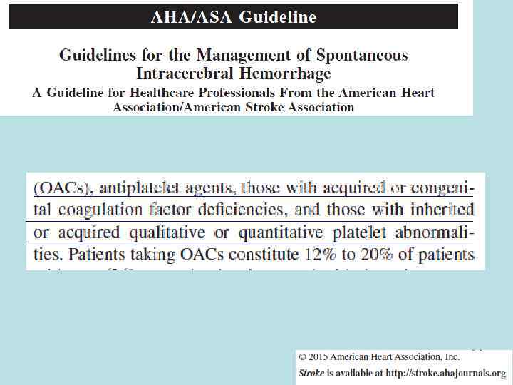 Рекомендации AHA/ASA, 2010 Инсульт Кардиоэмболический Некардиоэмболический • 1 линия – оральные • 1 линия – АСК антикоагулянты • 2 линия – АСК + дипиридамол • 2 линия – клопидогрель/тиклопидин/ тикагрелол/прасугрель Stroke, 2011; 42: 227 -276