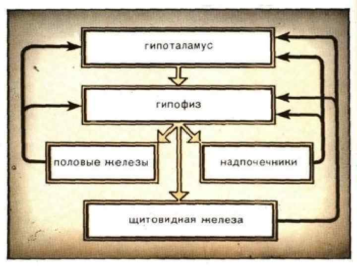 Нейрогуморальная регуляция Эндокринные железы небольшой величины, но богато кровоснабжены. Гормоны доставляются к органаммишеням кровью. Это гуморальная регуляция деятельности этих органов. Все процессы, протекающие в организме находятся под контролем центральной нервной системы. Такую двойную регуляцию деятельности органов называют нейрогуморальной. Главная роль в регуляции всего комплекса желез внутренней секреции принадлежит гипоталамусу, который обеспечивает взаимосвязь между нервной системой и эндокринными железами.