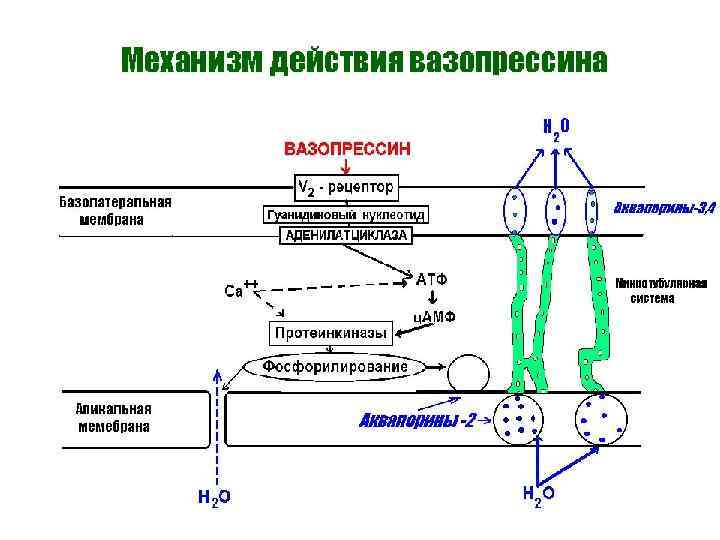 АКВАПОРИНЫ • Аквапорины – класс белковых молекул, встраивающихся в мембрану клетки и образующих водные каналы. • У млекопитающих описано 8 типов аквапоринов • Основные эффекторы вазопрессина – аквапорины – 2 типа