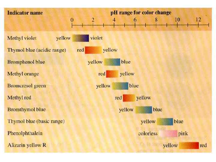 Зона перемены окраски индикатора (зависит от соотношения концентраций молекулярной и ионизированной форм) HInd ↔ H+ + Ind- 1. Метилоранж (3, 1 – 4, 4), р. К = 4, 0