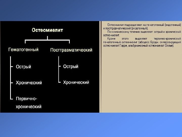 Этапы патогенеза остеомиелита § § § Фаза серозного воспаления костного мозга Внутрикостная гипертензия Воспаление кости Тромбоз сосудов Распространение процесса по гаверсовым каналам с воспалением надкостницы § Параоссальная флегмона