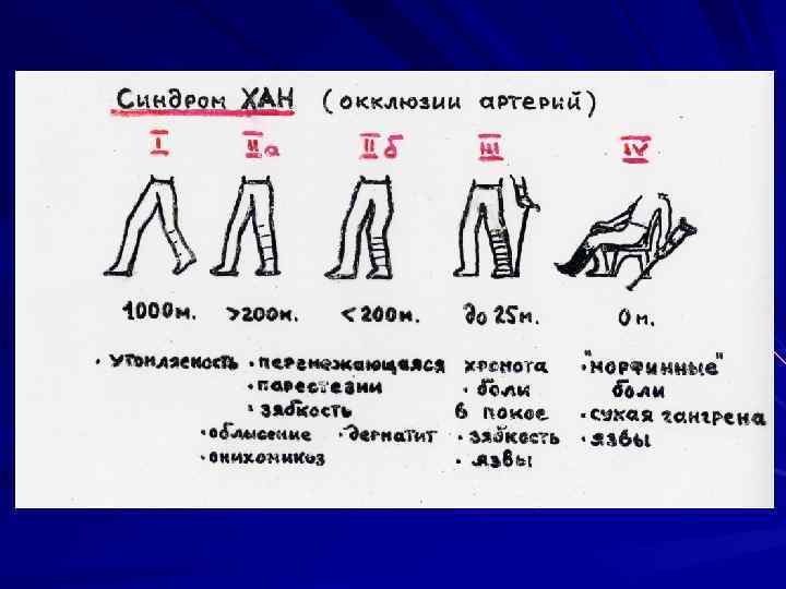 Хроническая артериальная недостаточность (ХАН) – синдром присущий так называемым облитерирующим заболеваниям конечностей, при которых развивается прогрессирующее сужение просвета магистральных артерий сегментарно или на протяжении в результате продолжительного спазма, продуктивного воспаления или атероматоза интимы