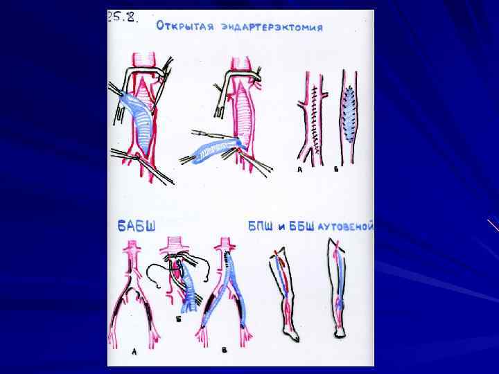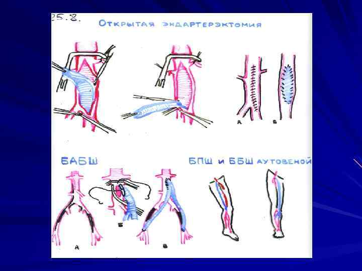 Лечение хронических облитерирующих заболеваний Оперативное (ХАН IIБ-IVст) - эндоваскулярная дилатация и ангиопластика - эндатерэктомия - профундопластика - шунтирование, протезирование - симпатэктомия, остеоперфорации - ампутации конечностей
