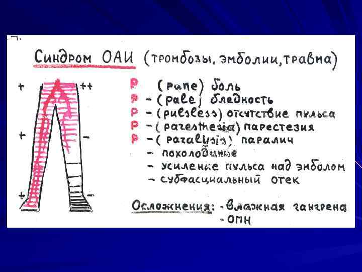 Первая врачебная помощь при ОАИ: В/в введение анальгетиков (наркотики). В/в введение мышечных спазмолитиков и гепарина в разовых дозах для снятия рефлекторного спазма и продолженного тромбоза коллатералей. Иммобилизация конечности Экстренная госпитализация в отделении ангиохирургии либо вызов бортангиохирурга на себя.