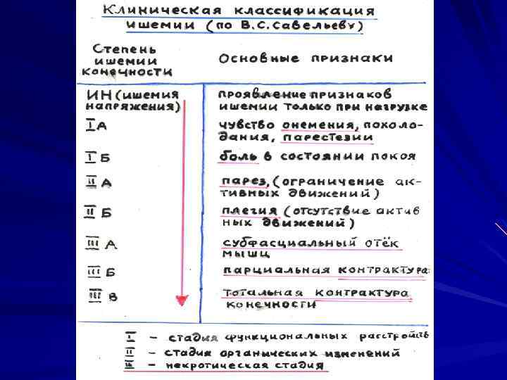 Классификация нарушений периферического кровообращения 4. По глубине нарушения кровообращения -компенсированные появляющиеся при функциональной нагрузке (I ст) -субкомпенсированные проявляющаяся при малых нагрузках с начальными органическими изменениями в тканях II ст. -декомпенсироавнные, приводящие к функциональной неполноценности и глубоким трофическим нарушениям в тканях (некрозы, язвы, гангрены) III-IV