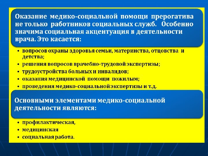 Элементы социальной работы: «Медико-социальная помощь» - вид общественно полезной межсекториальной деятельности работников социальных служб, при котором наряду с социально-бытовыми, юридическими, воспитательными и другими функциями выполняется определенный объем медицинских услуг по уходу за больными, престарелыми и детьми, а также ведется просветительская работа по гигиеническому воспитанию населения и профилактике заболеваний. «Медико-социальная работа» - это профессиональная деятельность междисциплинарного характера, направленная на оказание медико-реабилитационной, правовой, психологической, педагогической и социальнобытовой помощи гражданину в восстановлении и сохранении физического и психического здоровья, а также достижении социального благополучия.