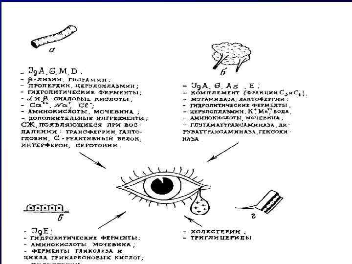 ФАКТОРЫ ИММУННОЙ ЗАЩИТЫ ОРГАНА ЗРЕНИЯ n Иммуноглобулины Ig. A, Ig. As, Ig. G, Ig. M, Ig. D, Ig. E n Компоненты комплемента C 3 – C 5 n IL-1α, IL-1β, IL-Ra, IL-2, IL-5, IL-6, Fas. L n TNF- α n Интерферон - γ