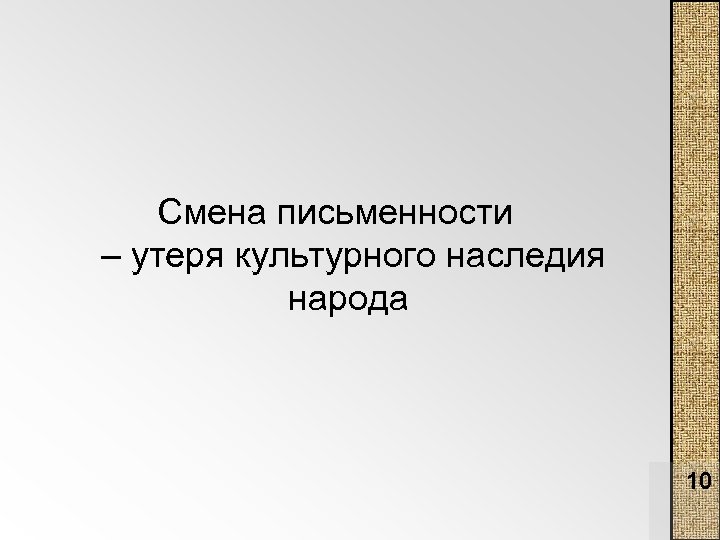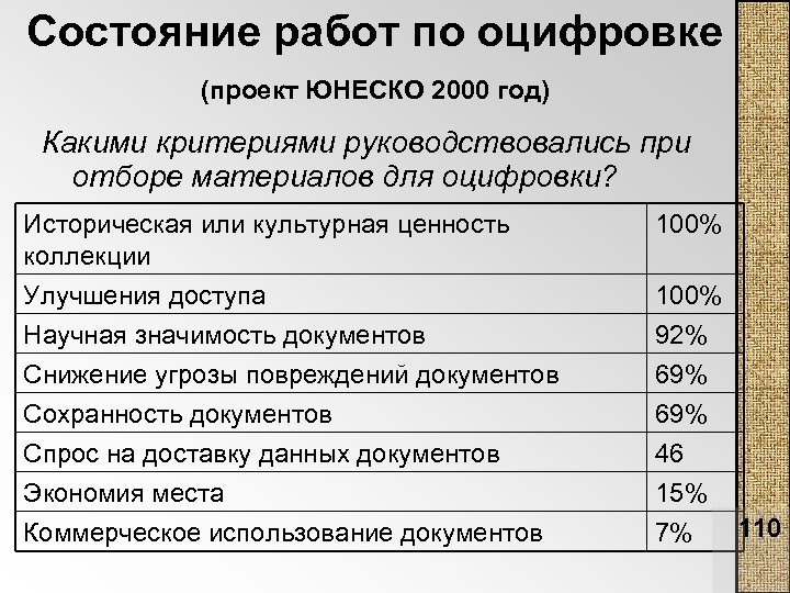 Состояние работ по оцифровке (проект ЮНЕСКО 2000 год) Какими критериями руководствовались при отборе материалов для оцифровки? Историческая или культурная ценность коллекции 100% Улучшения доступа Научная значимость документов Снижение угрозы повреждений документов Сохранность документов Спрос на доставку данных документов Экономия места Коммерческое использование документов 100% 92% 69% 46 15% 110 7%