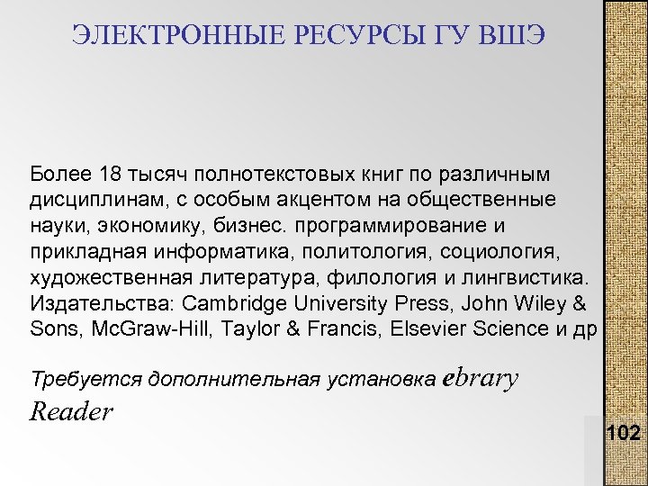 ЭЛЕКТРОННЫЕ РЕСУРСЫ ГУ ВШЭ Более 18 тысяч полнотекстовых книг по различным дисциплинам, с особым акцентом на общественные науки, экономику, бизнес. программирование и прикладная информатика, политология, социология, художественная литература, филология и лингвистика. Издательства: Cambridge University Press, John Wiley & Sons, Mc. Graw-Hill, Taylor & Francis, Elsevier Science и др Требуется дополнительная установка ebrary Reader 102