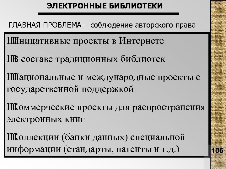 ЭЛЕКТРОННЫЕ БИБЛИОТЕКИ ГЛАВНАЯ ПРОБЛЕМА – соблюдение авторского права Ш Иницативные проекты в Интернете Ш составе традиционных библиотек В Ш Национальные и международные проекты с государственной поддержкой Ш Коммерческие проекты для распространения электронных книг Ш Коллекции (банки данных) специальной информации (стандарты, патенты и т. д. ) 106