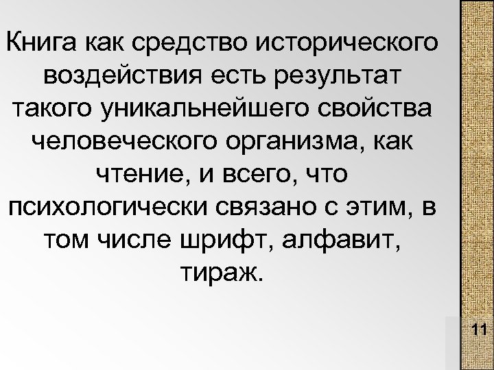 Книга как средство исторического воздействия есть результат такого уникальнейшего свойства человеческого организма, как чтение, и всего, что психологически связано с этим, в том числе шрифт, алфавит, тираж. 11