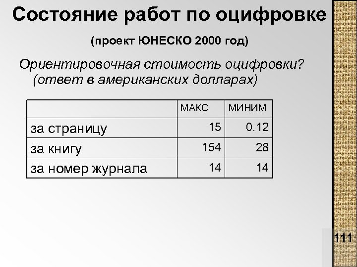 Состояние работ по оцифровке (проект ЮНЕСКО 2000 год) Ориентировочная стоимость оцифровки? (ответ в американских долларах) МАКС за страницу за книгу за номер журнала МИНИМ 15 0. 12 154 28 14 14 111