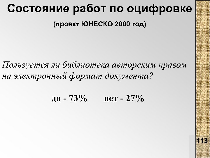 Состояние работ по оцифровке (проект ЮНЕСКО 2000 год) Пользуется ли библиотека авторским правом на электронный формат документа? да - 73% нет - 27% 113