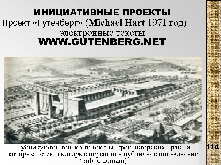 ИНИЦИАТИВНЫЕ ПРОЕКТЫ Проект «Гутенберг» (Michael Hart 1971 год) электронные тексты WWW. GUTENBERG. NET Публикуются только те тексты, срок авторских прав на которые истек и которые перешли в публичное пользование (public domain) 114