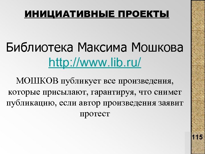 ИНИЦИАТИВНЫЕ ПРОЕКТЫ Библиотека Максима Мошкова http: //www. lib. ru/ МОШКОВ публикует все произведения, которые присылают, гарантируя, что снимет публикацию, если автор произведения заявит протест 115