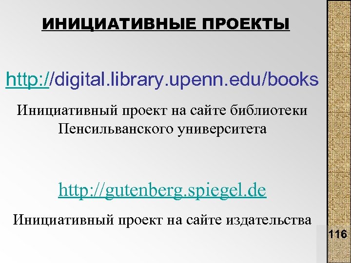 ИНИЦИАТИВНЫЕ ПРОЕКТЫ http: //digital. library. upenn. edu/books Инициативный проект на сайте библиотеки Пенсильванского университета http: //gutenberg. spiegel. de Инициативный проект на сайте издательства 116