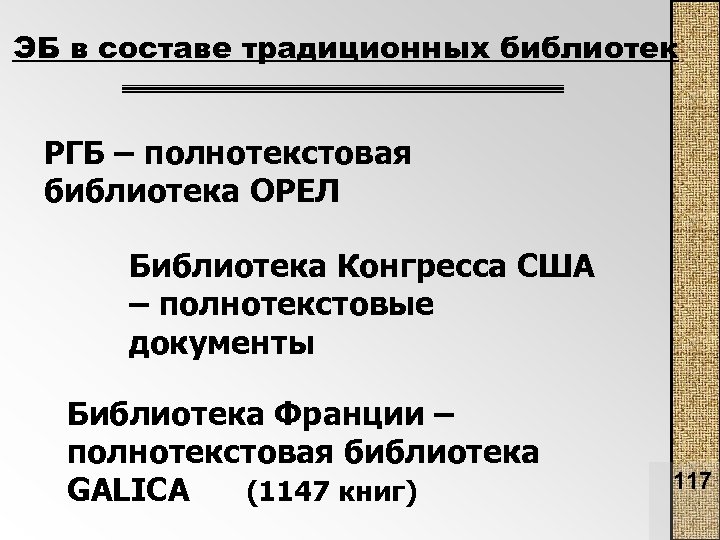 ЭБ в составе традиционных библиотек РГБ – полнотекстовая библиотека ОРЕЛ Библиотека Конгресса США – полнотекстовые документы Библиотека Франции – полнотекстовая библиотека GALICA (1147 книг) 117