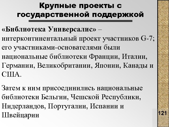 Крупные проекты с государственной поддержкой «Библиотека Универсалис» – интерконтинентальный проект участников G 7; его участниками основателями были национальные библиотеки Франции, Италии, Германии, Великобритании, Японии, Канады и США. Затем к ним присоединились национальные библиотеки Бельгии, Чешской Республики, Нидерландов, Португалии, Испании и Швейцарии 121