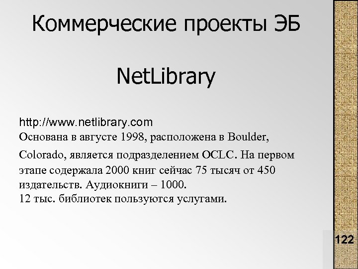 Коммерческие проекты ЭБ Net. Library http: //www. netlibrary. com Основана в августе 1998, расположена в Boulder, Colorado, является подразделением OCLC. На первом этапе содержала 2000 книг сейчас 75 тысяч от 450 издательств. Аудиокниги – 1000. 12 тыс. библиотек пользуются услугами. 122