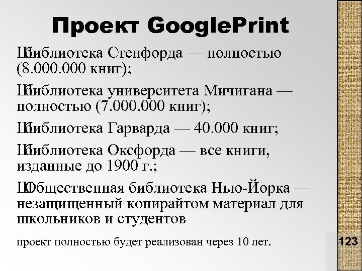 Проект Google. Print Ш библиотека Стенфорда — полностью (8. 000 книг); Ш библиотека университета Мичигана — полностью (7. 000 книг); Ш библиотека Гарварда — 40. 000 книг; Ш библиотека Оксфорда — все книги, изданные до 1900 г. ; Ш Общественная библиотека Нью Йорка — незащищенный копирайтом материал для школьников и студентов проект полностью будет реализован через 10 лет. 123