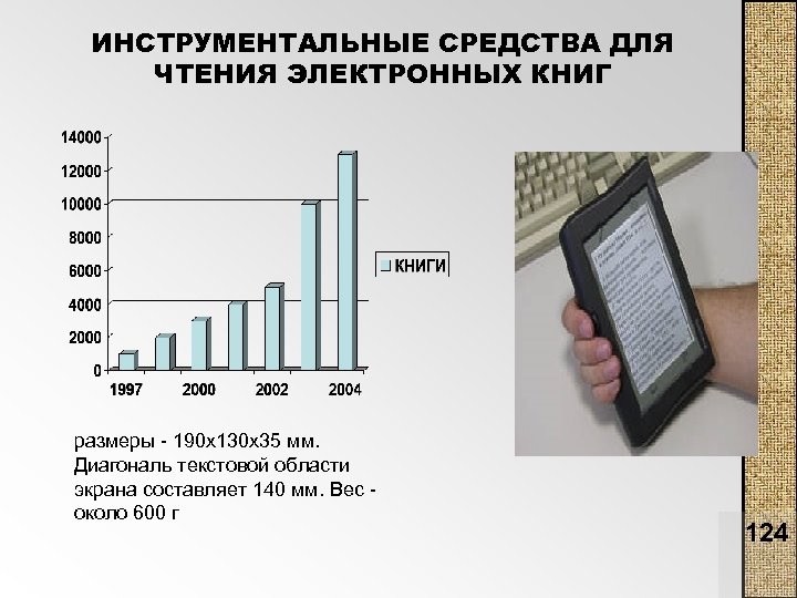 ИНСТРУМЕНТАЛЬНЫЕ СРЕДСТВА ДЛЯ ЧТЕНИЯ ЭЛЕКТРОННЫХ КНИГ размеры - 190 х130 х35 мм. Диагональ текстовой области экрана составляет 140 мм. Вес - около 600 г 124